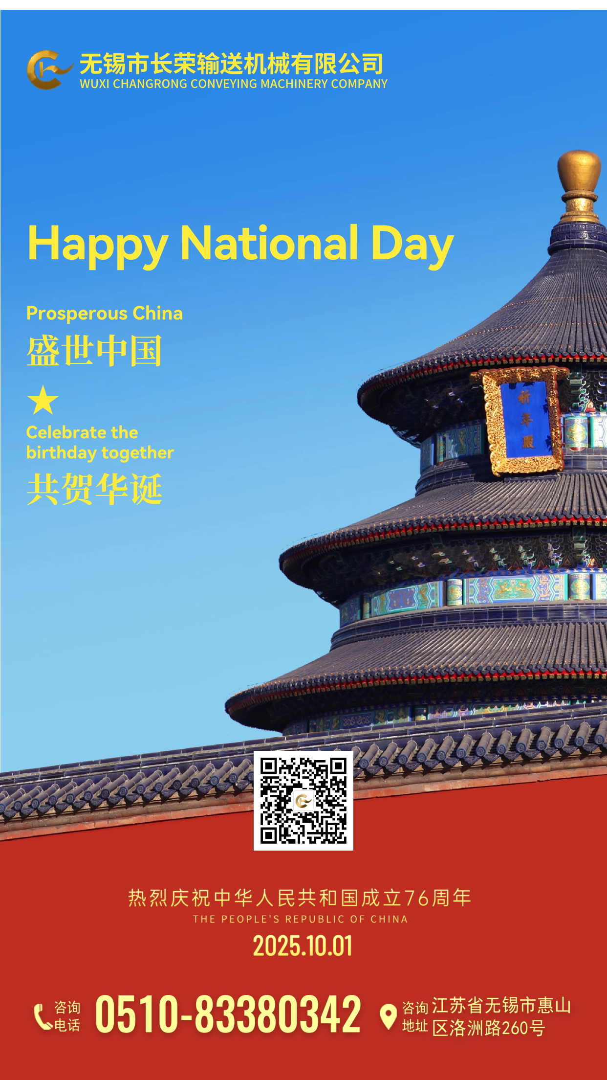 In praise of the birthday of our motherland! Wuxi Changrong Conveying Machinery wishes our motherland prosperity and strength!